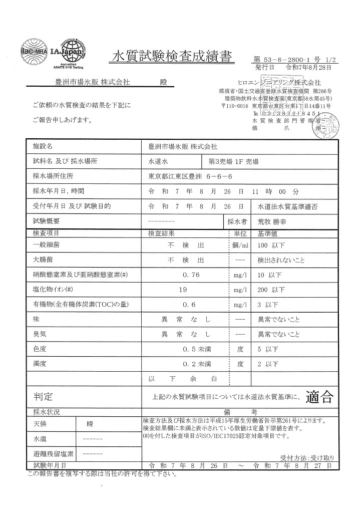 取り扱い商品日本最大級の魚市場、豊洲市場に構える当社の氷を是非ご利用下さい。 砕氷(プレート氷) 弊社で販売する砕氷(プレート氷)は、透明で硬くマイナス温度となっており、 溶けるまでの時間が長く保冷性に優れているため、お魚を新鮮に保つのに 適しています。 おすすめの用途 食材の保冷(鮮魚)・アイスベッド イベントクーラー・クーラーボックス バーベキュー アイシング 通販で購入する フレーク氷 氷の粒が、非常に細かくさらさらしているので、お魚へのダメージが少なく、特に、青魚や川魚の保存に最適です。フレーク氷も、自動製氷機により水道水を原料として製氷された氷なので、手元に届くまで人の手に全く触れることがなく、安心してご購入していただけます。※現在は市場内事業者様への販売のみとなっております。 おすすめの用途 食材の保冷(鮮魚)・アイスベッド 安心安全な氷をご提供 豊洲市場氷販では安心安全な氷をお届けするために、毎年環境省・国土交通省登録水質検査機関に厳しい品質チェックを行っております。 検査概要 検査機関ヒロエンジニアリング株式会社検査日令和7年8月28日 検査項目 一般細菌不検出大腸菌不検出硝酸態窒素及び亜硝酸態窒素0.76mg/l塩化物イオン19mg/l有機物(全有機体炭素(TOC)の量)0.6mg/l味異常なし臭気異常なし色度0.5度未満濁度0.2度未満 過去の水質検査資料 令和7年2月 水質検査 資料 ご利用イメージ 砕氷(プレート氷) 砕氷(プレート氷) 砕氷(プレート氷) 砕氷(プレート氷) お客様の声 出張イベントで使用させて頂きました。イベント会場の住所が時間指定が出来ない区域だったのですが、お電話でフレキシブルに対応して頂き、無事に開催できました。大変助かりありがとうございました!また機会がありましたら豊洲市場氷販さんに頼みたいです。 氷販 太郎 イベント企画会社CEO 東京都内の寿司屋で板前をしている者です。氷は寿司の隠れた主役であると言えるでしょう。透明度、温度管理、形状、そしてアクセントの要素を考慮し、当店では氷に対するこだわりを貫いています。これにより、お客様には最高の寿司体験を提供することができます。 豊洲 二郎 都内寿司屋勤務 今年のトライアスロン大会で業務用氷を初めて使用しましたが、非常に満足しています。真夏日に選手達の冷却手段として最適でした。特にアイスバスの準備に大変役立ちました。氷は溶けにくく高品質で、配達もして貰えて良かったと思います。来年もぜひ利用したいです。 豊洲 三郎 トライアスロン大会運営団体 購入に関する問合せ 必要な氷についてお伺いします。 必要な氷の種類必須 砕氷(プレート氷) 必要な量(kg)必須 ※当社の販売単位は11kgとなります 受取日程(任意) 用途(任意) 配達住所(任意) 貴方様についてお伺いします。 会社名(任意) 氏名必須 メールアドレス必須 電話番号(任意) 個人情報保護の同意必須 プライバシポリシーに同意する 弊社を何で知りましたか(任意) ご紹介・口コミWebSNSチラシその他 お問い合わせ内容を確認後、担当者よりご連絡させていただきます。 お急ぎの場合や、お問い合わせ後1〜2営業日以内に返信がない場合は、お手数ですがお電話 03-6633-0811 にてご連絡ください。